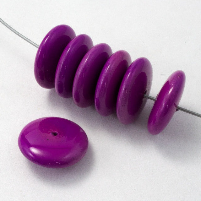 These beads are a bright pink-plum purple that goes well with other bright cool colors. A set of three disks between round or oval beads of compatible size look great in necklaces, and these are lightweight and easy to use.