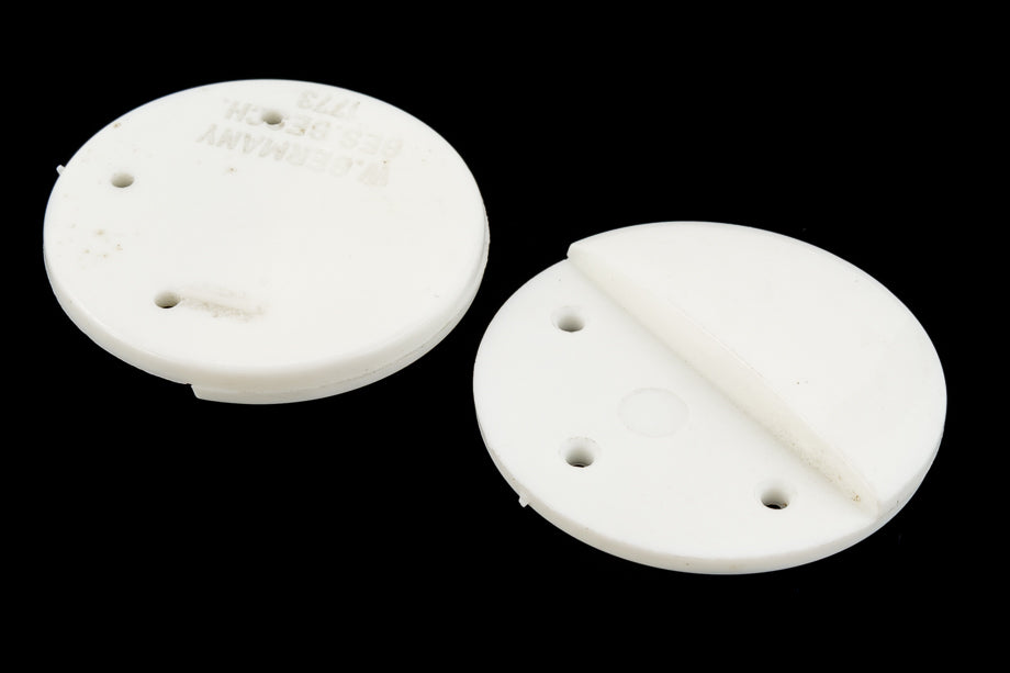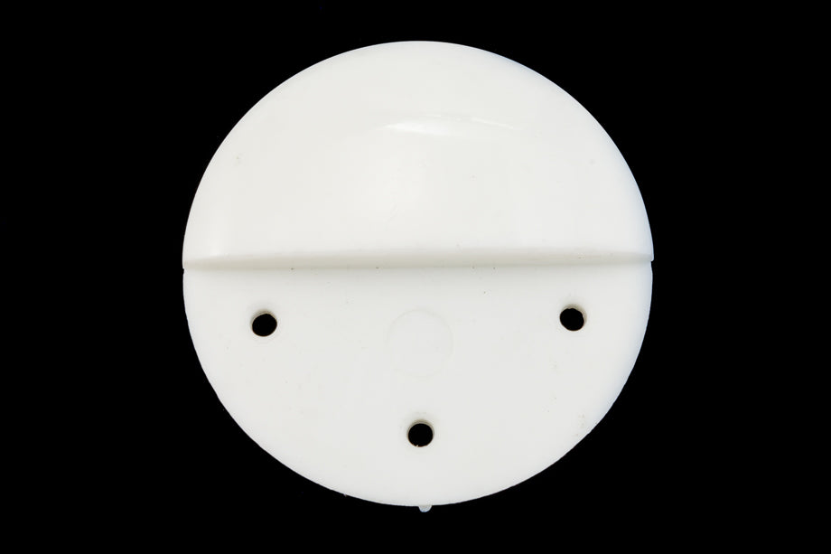 34mm opaque white round disc with raised smooth semicircle on one side and 3 holes on the other.