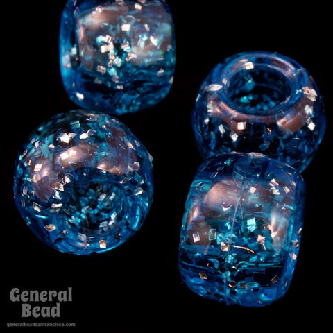 6mm x 9mm transparent blue and glitter pony bead with 3mm hole.