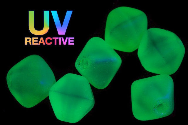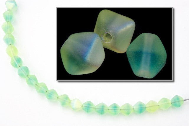 6mm smooth glass bicone bead in matte transparent Kelly green and aqua. Standard hole.