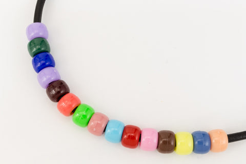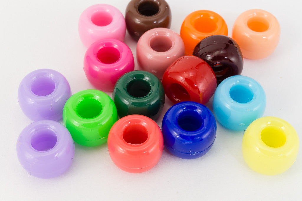 Opaque 6mm x 9mm plastic Pony style craft beads in a mix of colors.