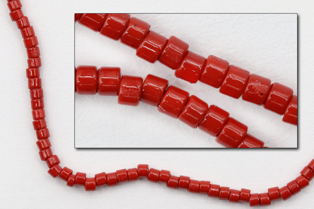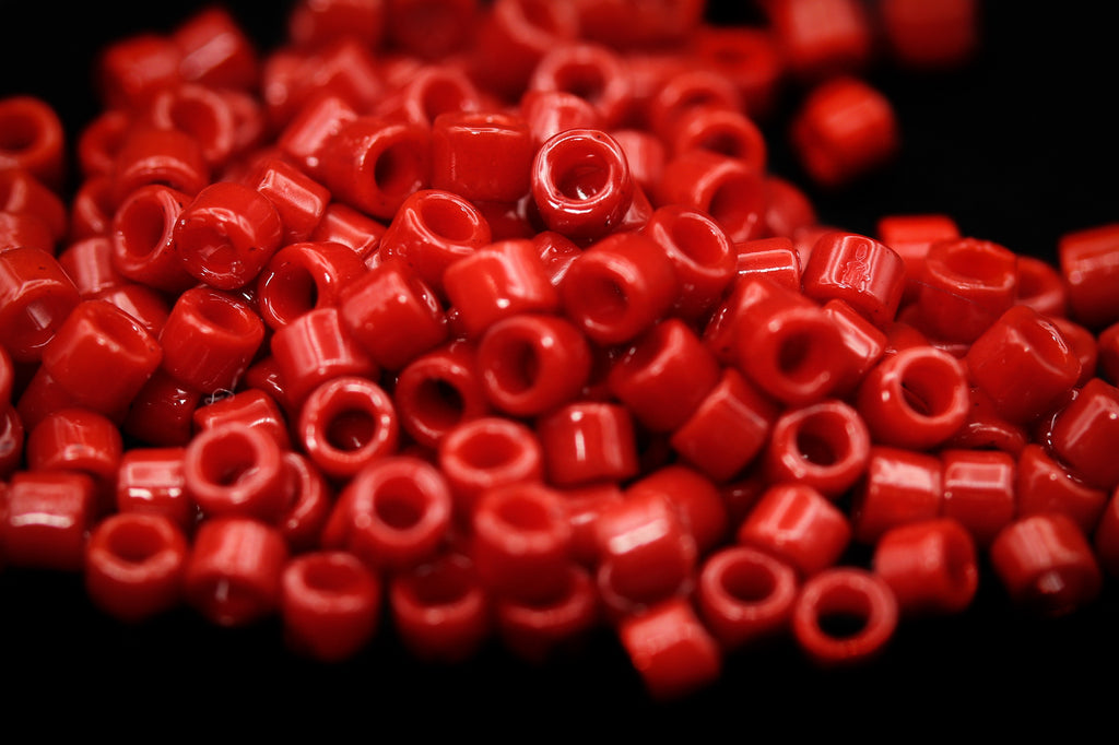 Size 11/0 Duracoat opaque dyed Shanghai red cylinder seed bead.