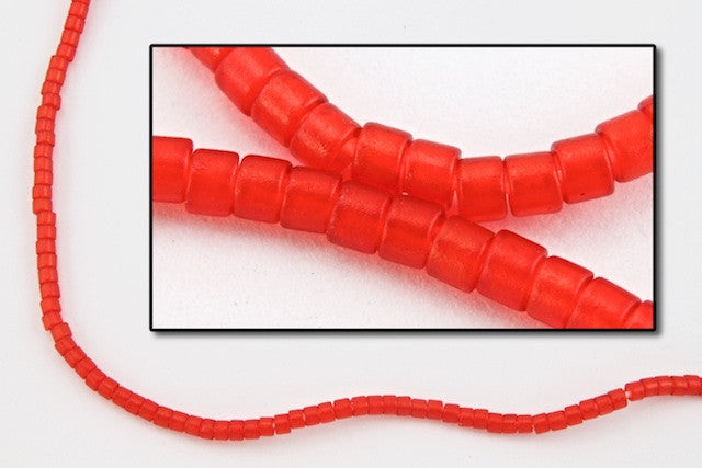 Size 11/0 dyed matte transparent red cylinder seed bead.