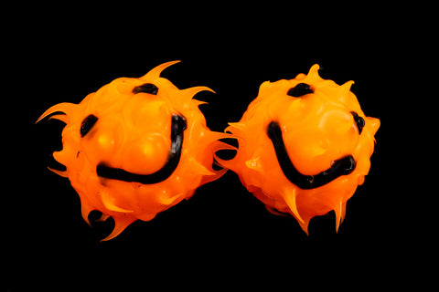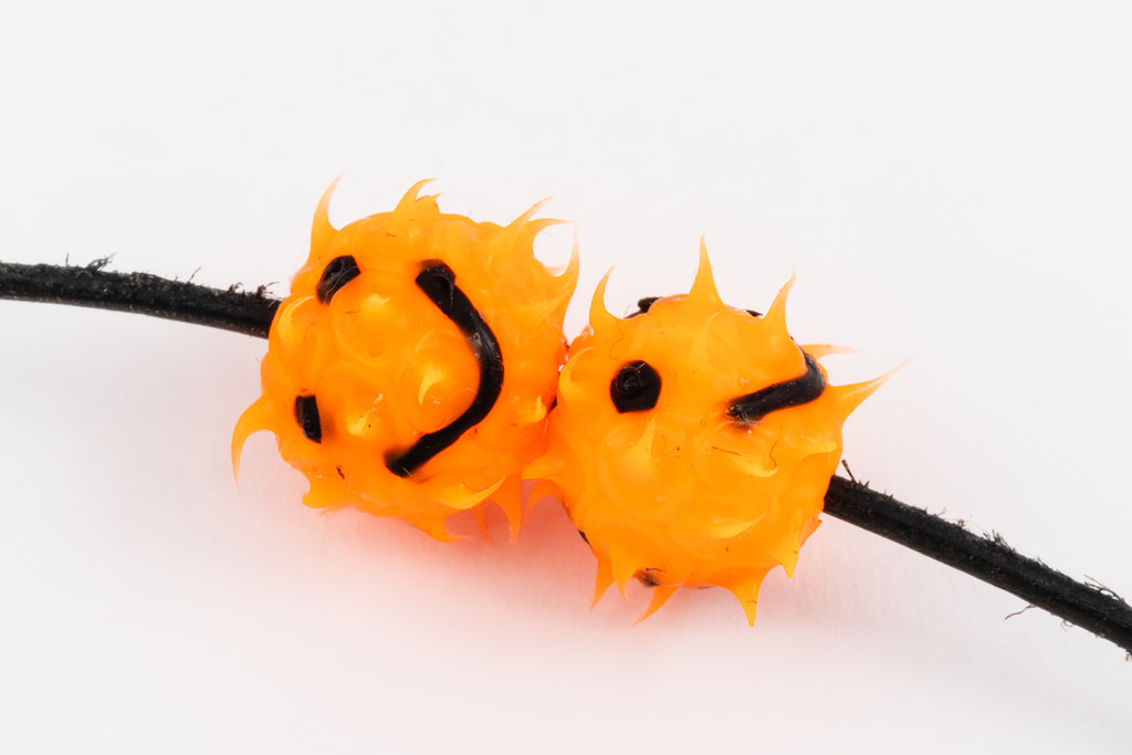 10mm bright orange round rubber beads with soft spikes and smiley face.