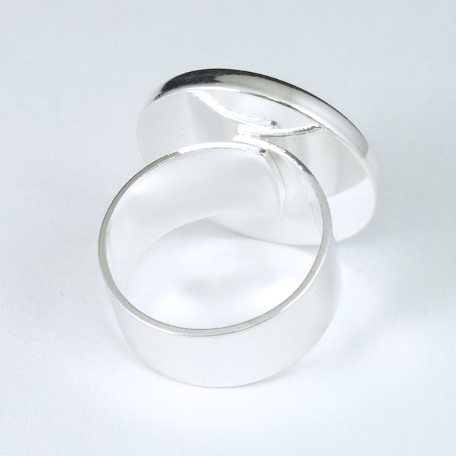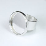 Silver plated ring base with 30mm round setting and adjustable band.