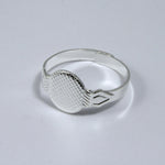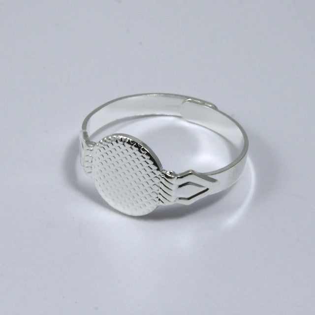 Simple ring base with silver finish, adjustable band and 10mm round pad.