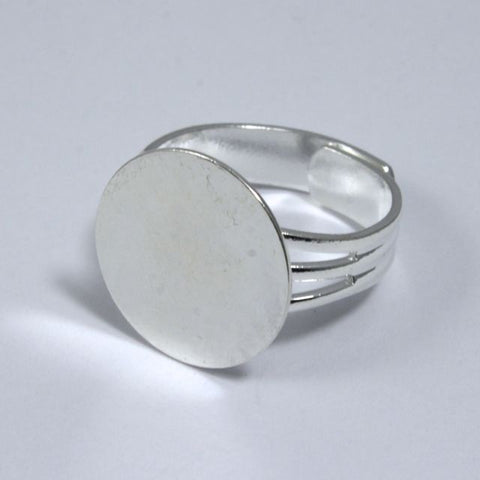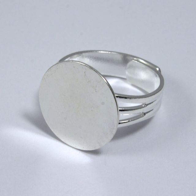 Decorative ring base with silver finish, adjustable band and 15mm glue on pad.
