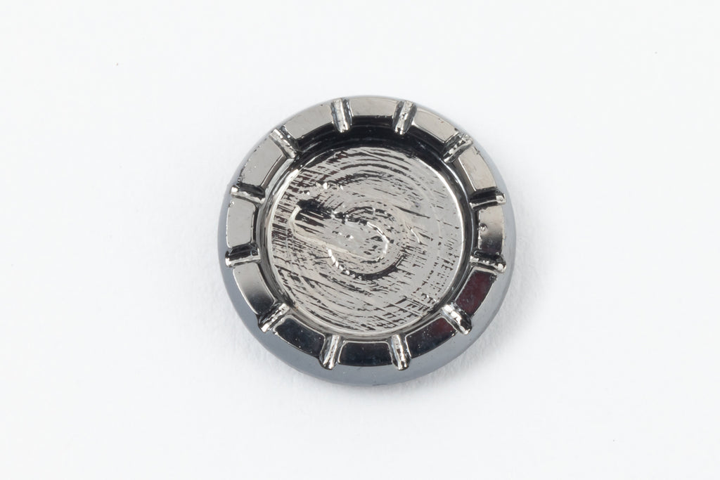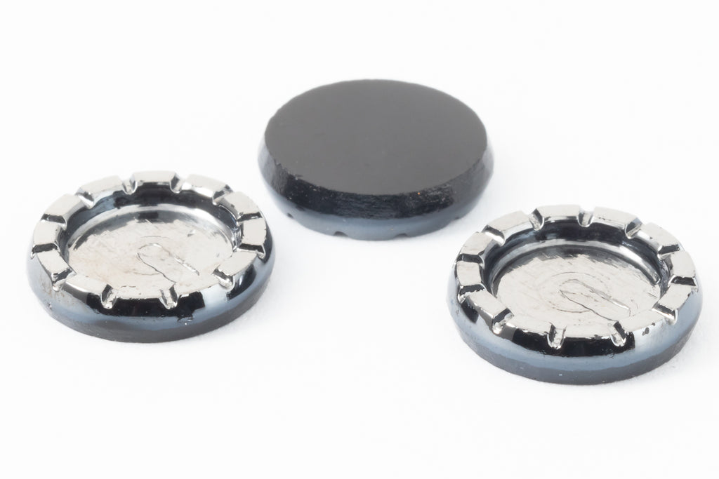 Vintage glass cabochon.10.16mm shiny hematite round flat back. Border measures 2.31mm.Central setting fits 30ss rhinestone or 6.5mm stone.Made in Germany or the Czech Republic in the 1960's or earlier.Sold individually.