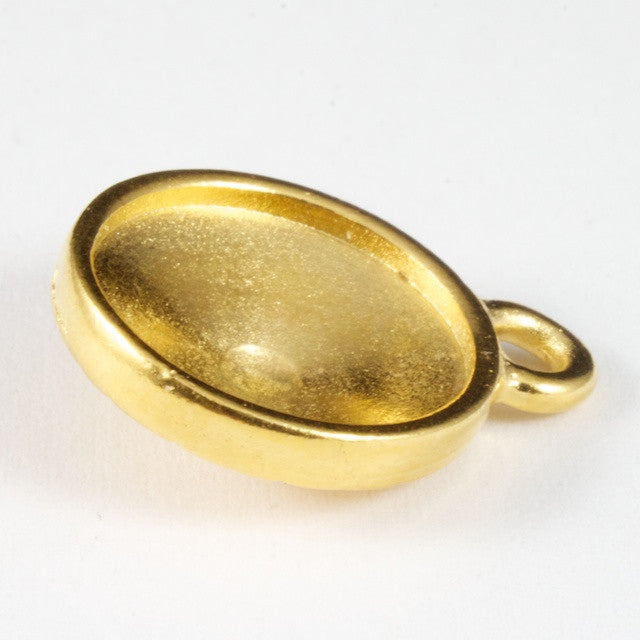 18.25mm x 14.25mm bright gold cabochon setting for 12mm rivoli. Loop measures 2mm. Fits Swarovski article 1122.