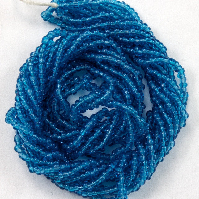 Size 14/0 transparent dark aqua antique Venetian glass micro seed beads.