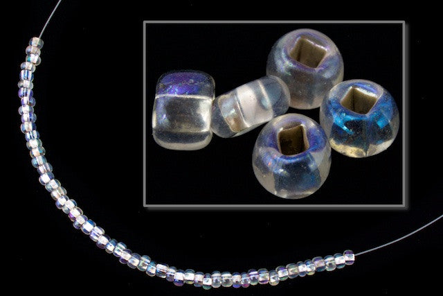 Size 6 silver lined crystal seed beads with iridescent sheen.