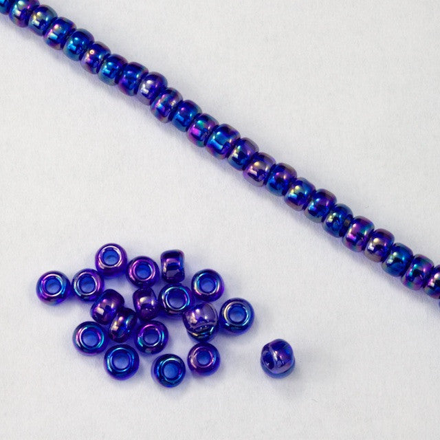 Size 8 transparent cobalt AB seed bead.
