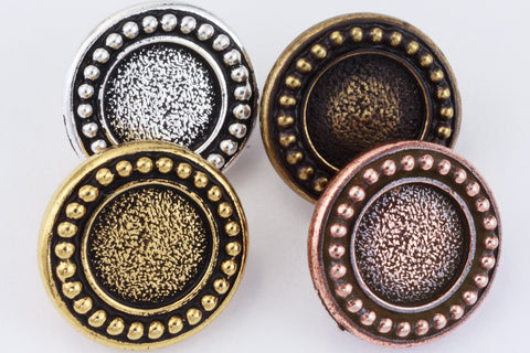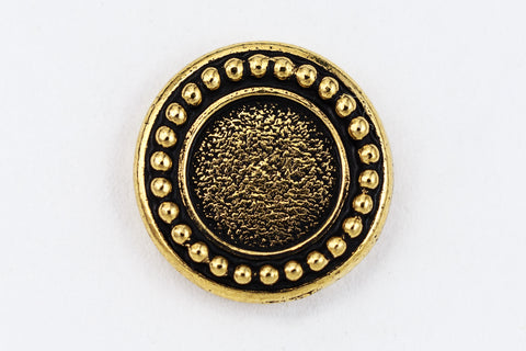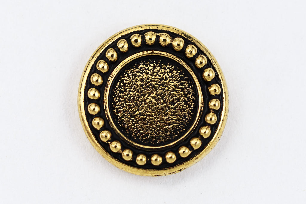 12.3mm antique gold round pewter button with beaded border and 2.4mm shank on back.