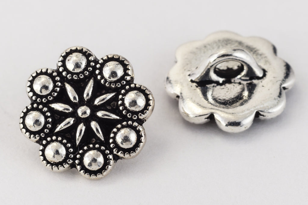 12.25mm antique silver Czech style rosette pewter button with 2.2mm shank on back. Measures 4.75mm high.