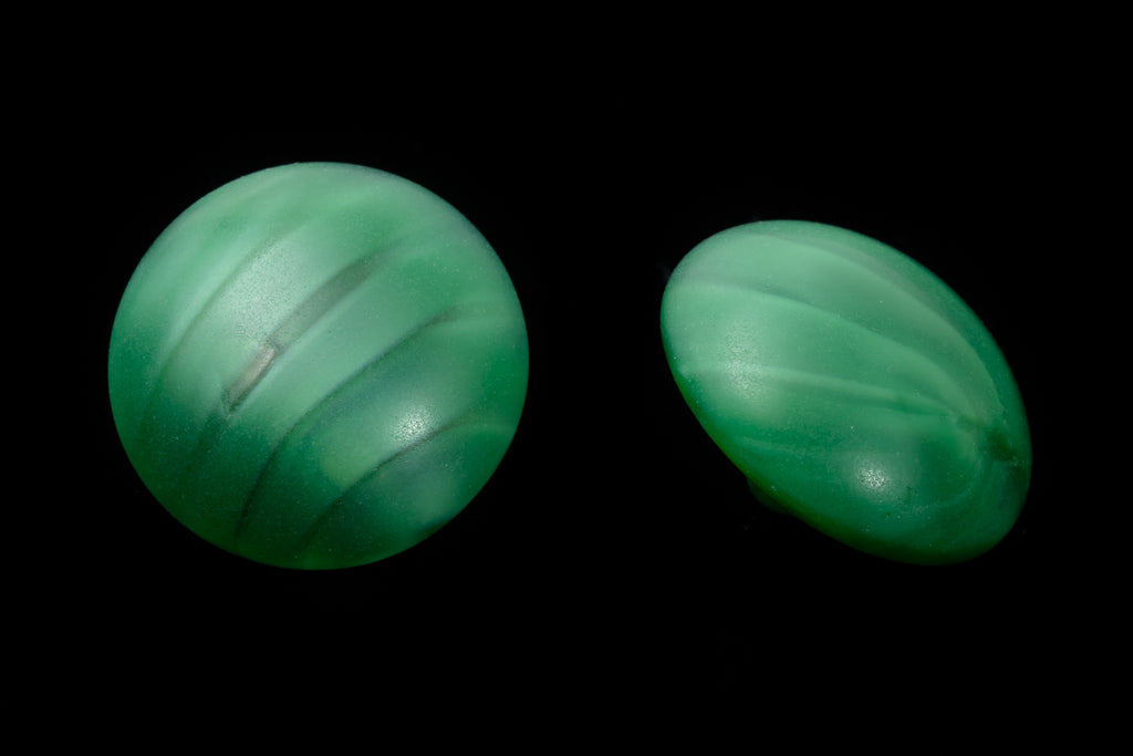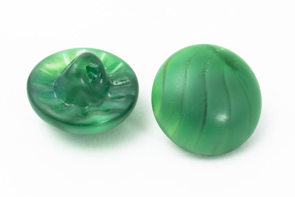 12mm domed glass button with dark and medium green striations and molded shank on back.