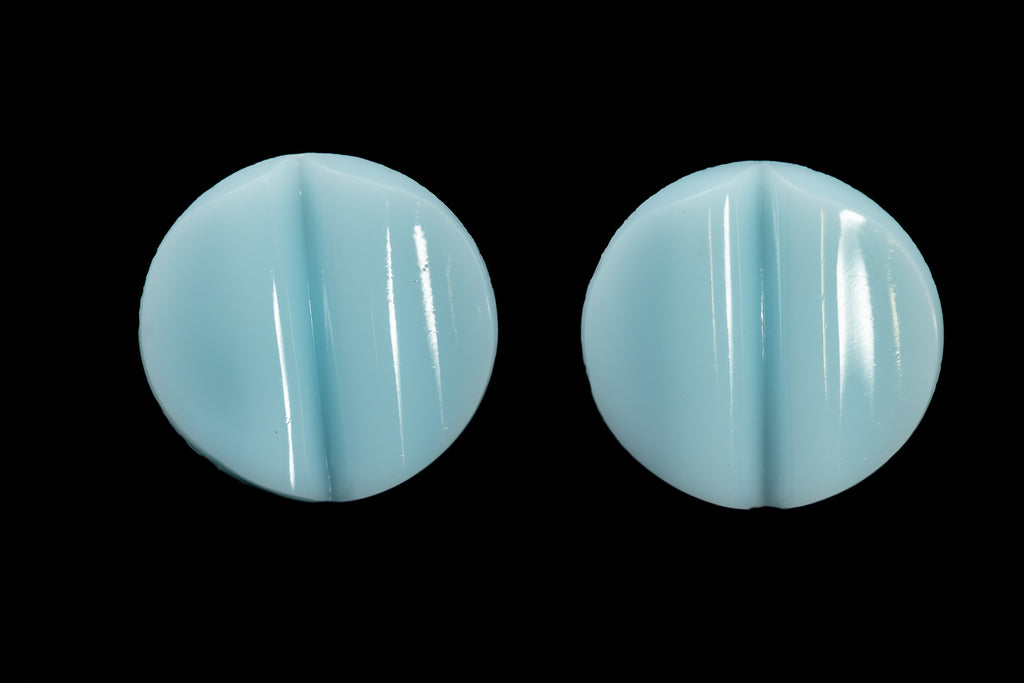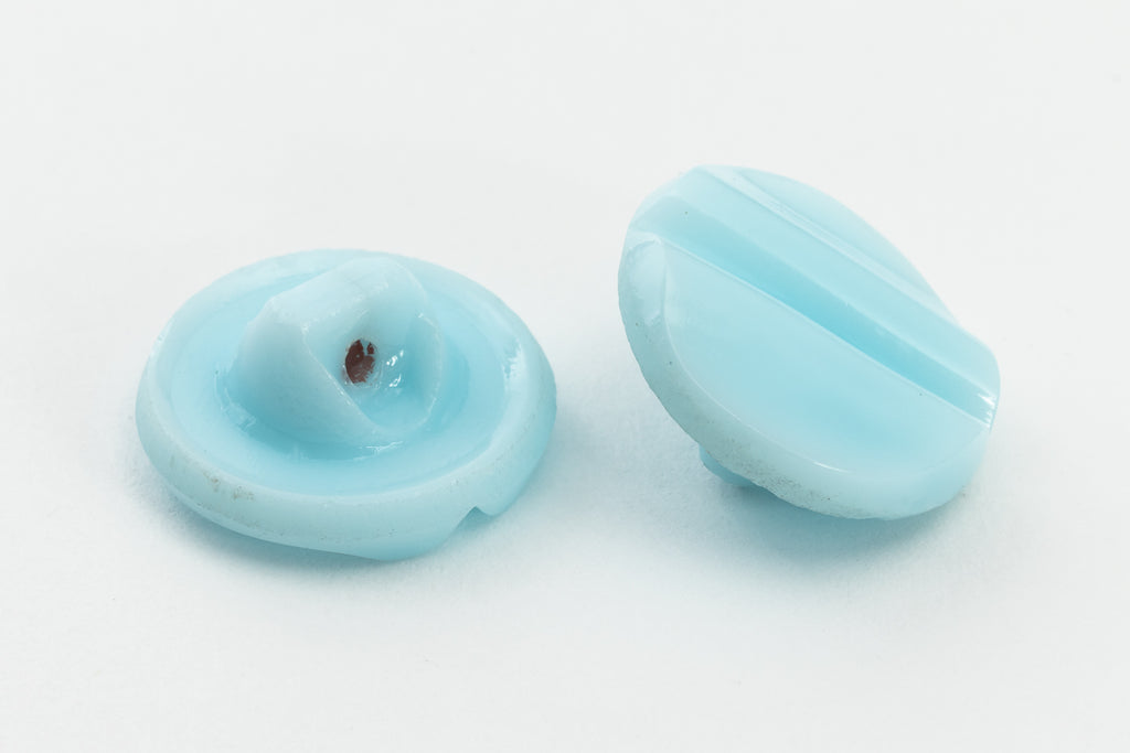 13.42mm opaque light blue glass button with beveled surface and molded shank on back.