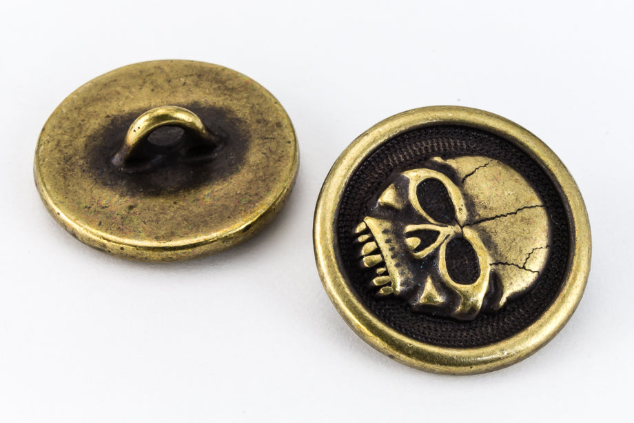 17mm antique brass round pewter button with spooky skull and 2.25mm shank on back.