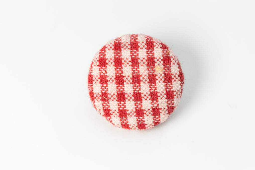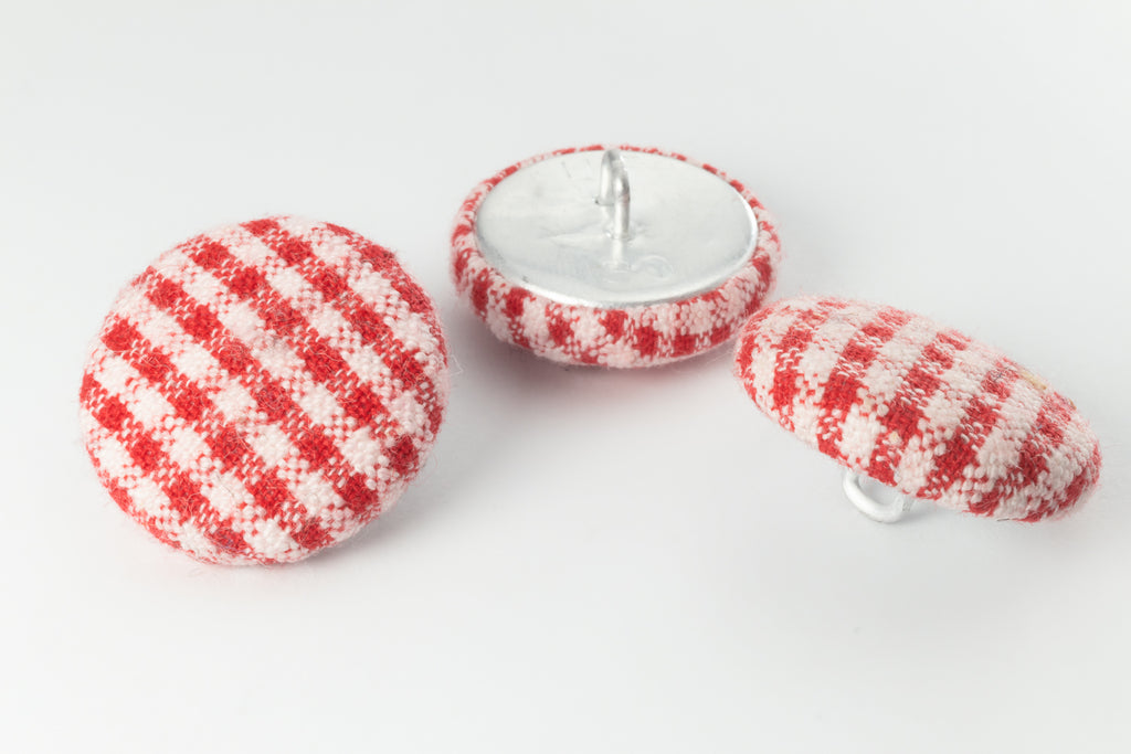 19mm (3/4") domed button covered in red gingham fabric with steel shank.
