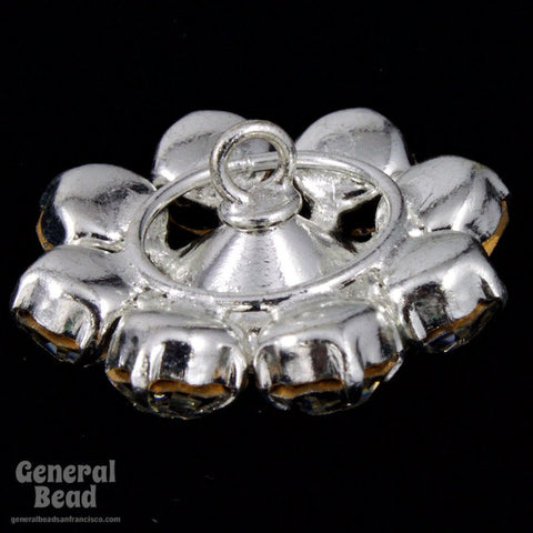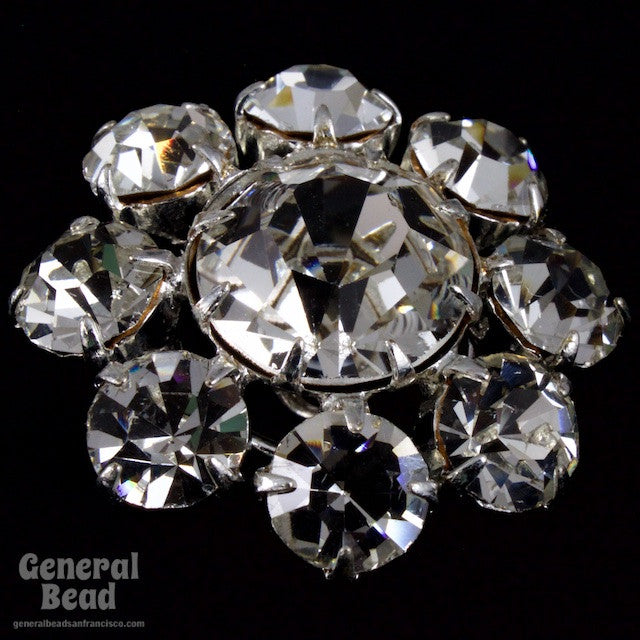 10mm stone in center surrounded by eight 5mm stones and metal shank on back.