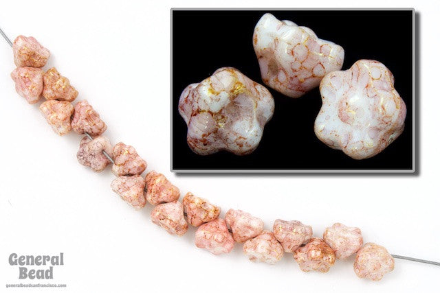 7mm opaque glass flower with mottled white and pink coloration and button back.