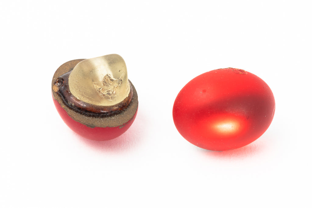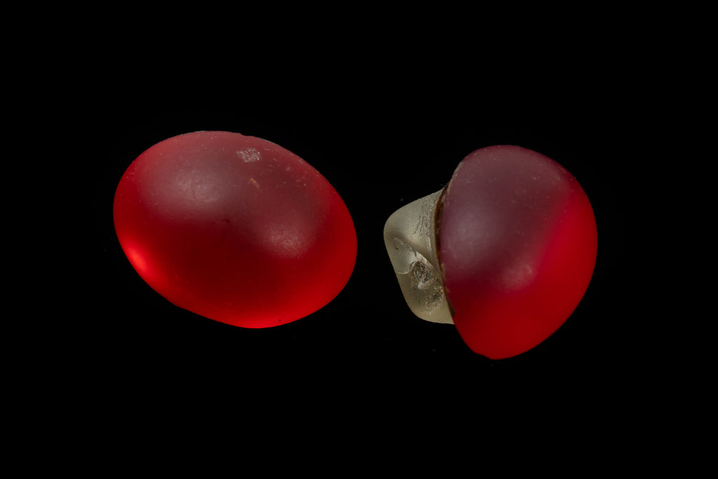7mm x 9mm matte transparent ruby domed oval button with molded shank on back.