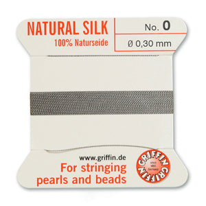 Silk pearl cord with attached wire needle for bead stringing.