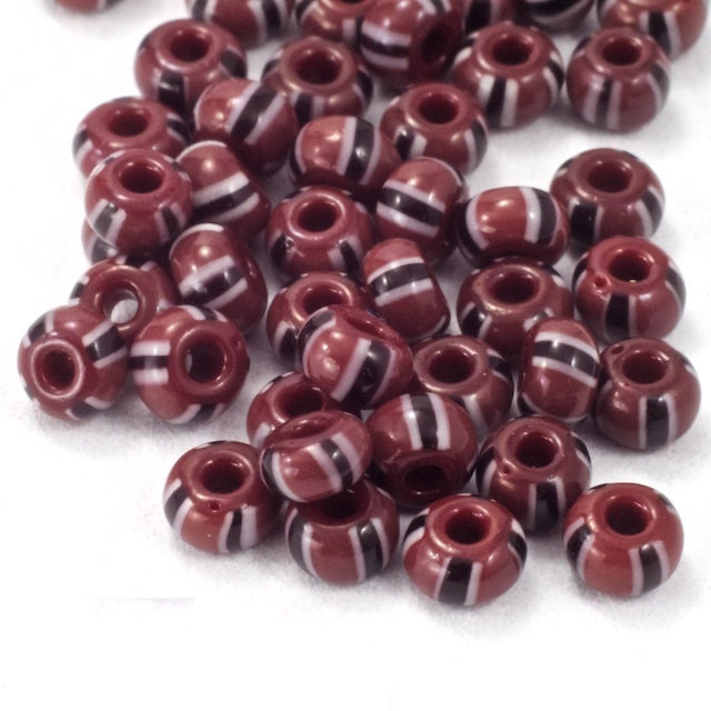 Size 10 mahogany brown seed bead with black and white stripe pattern.