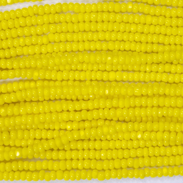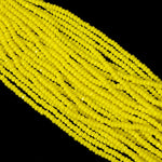 Size 11/0 Charlotte cut opaque dark yellow glass seed beads.