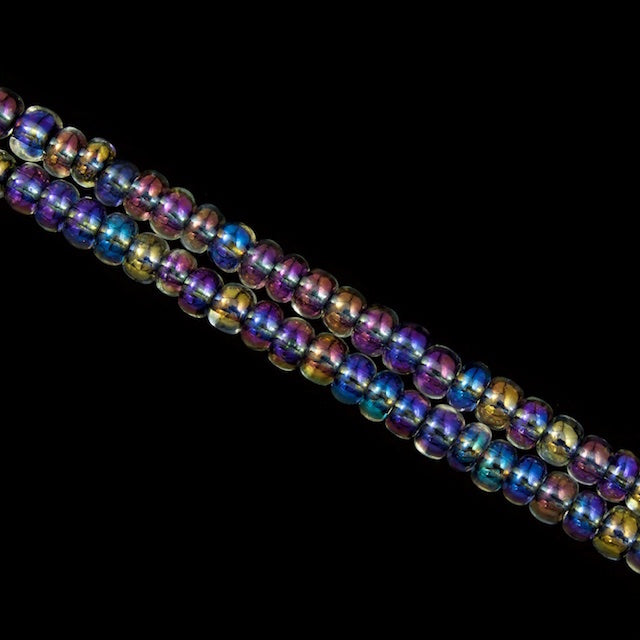 Size 11 black lined iridescent crystal seed bead.
