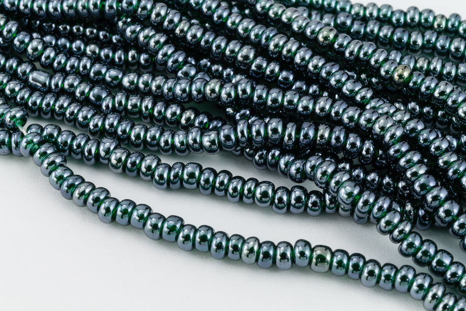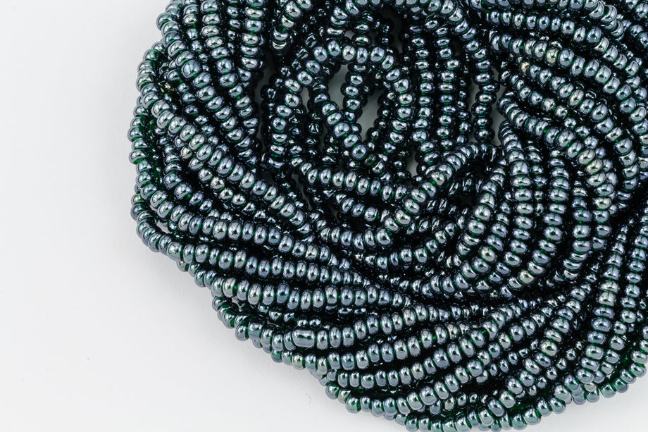 Size 11 luster transparent evergreen seed bead.