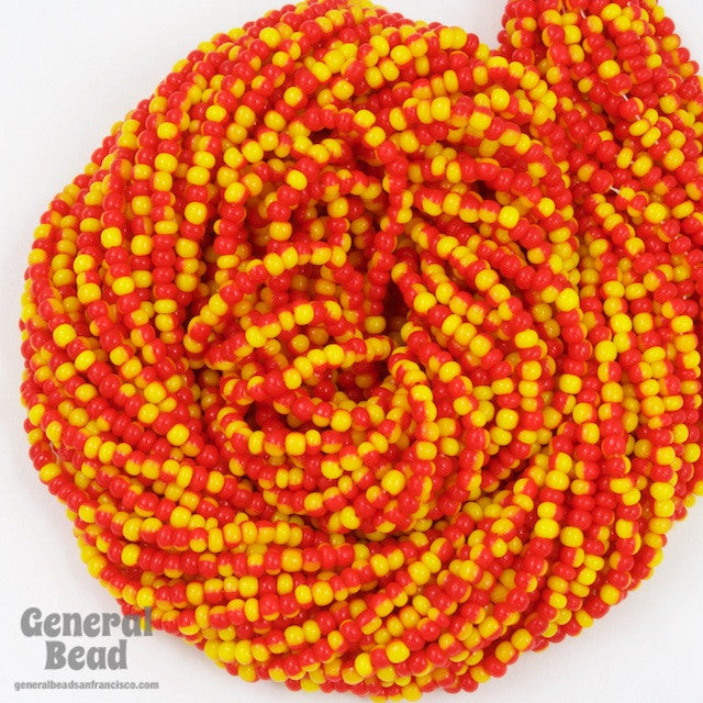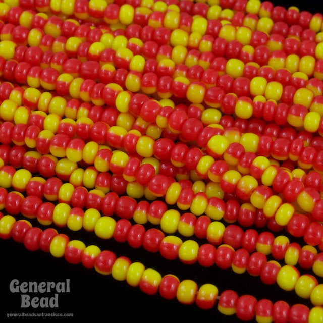 Size 11 opaque red and yellow two tone seed bead.