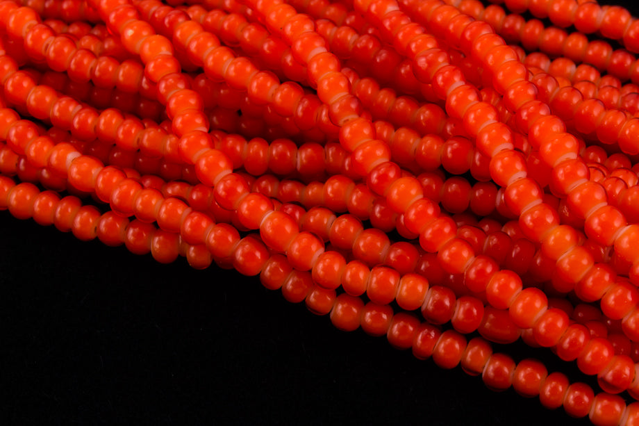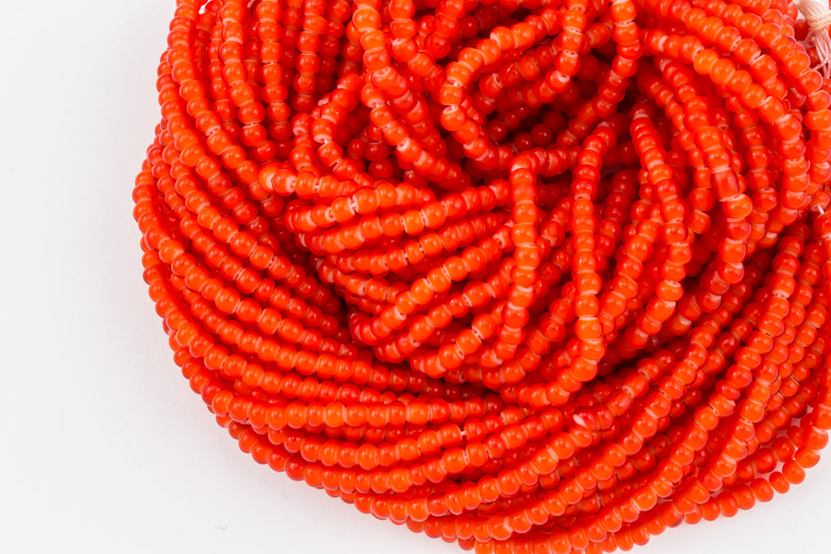Size 12/0 opaque red seed bead with white heart.