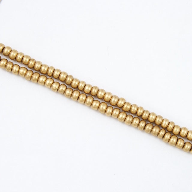 Size 13/0 (1.7mm) glass seed beads in matte metallic gold.