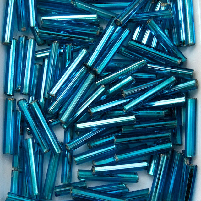 Glass bead- 7/16 inch or 11mm size 5 silver lined aqua bugle.