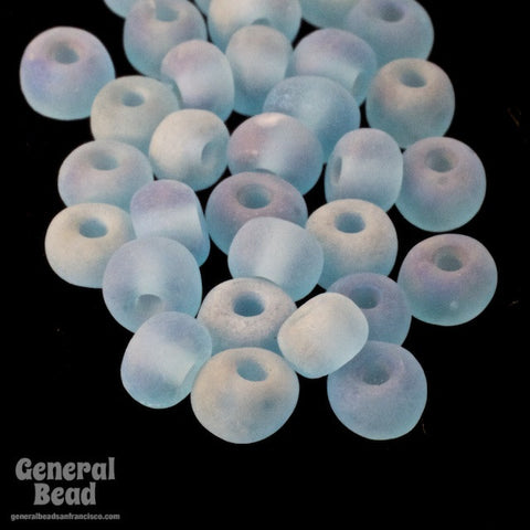 Size 5/0 matte transparent iridescent aqua seed bead.
