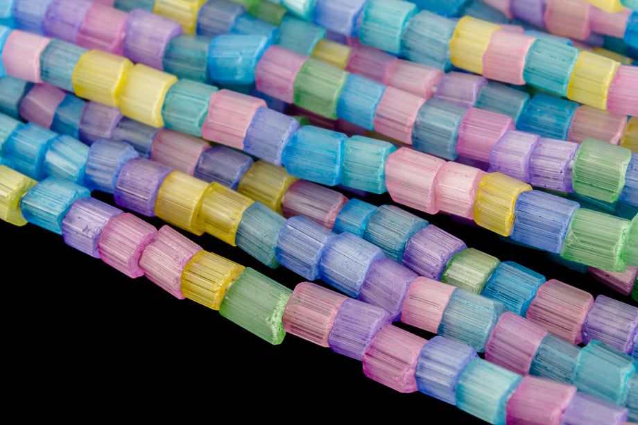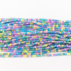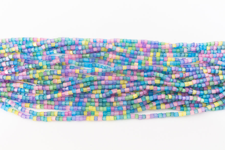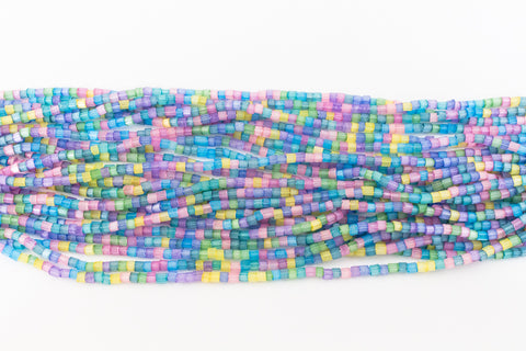 Size 8/0 faceted hex cut six sided seed bead in a "Unicorn" mix of matte transparent pastel colors.