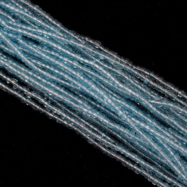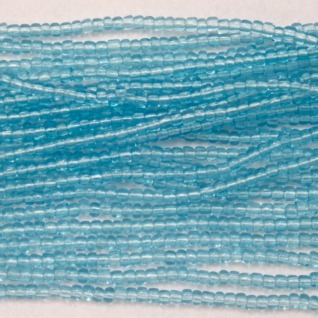 Size 8 transparent light aqua seed beads.