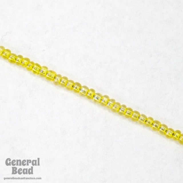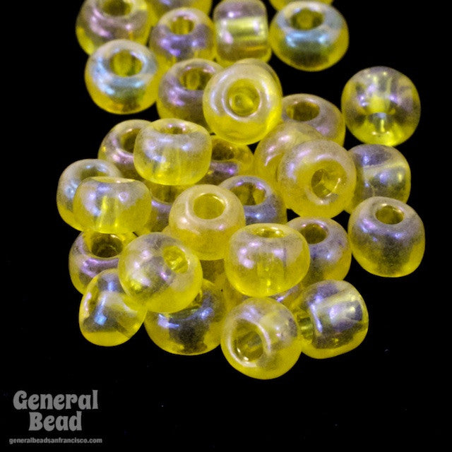Size 8 transparent yellow seed bead with iridescent sheen.