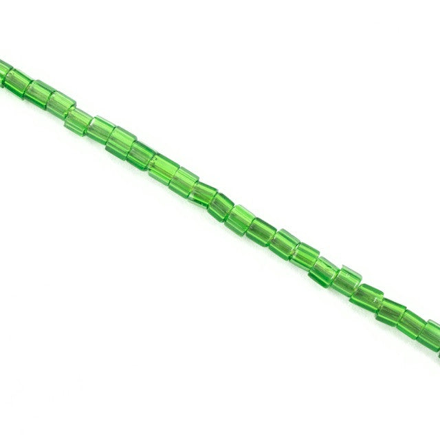 Size 8/0 transparent emerald hex seed bead.