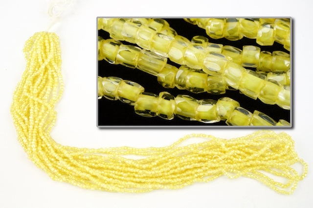 Size 9/0 (2.6mm ) 3-cut glass seed bead in jonquil lined crystal.