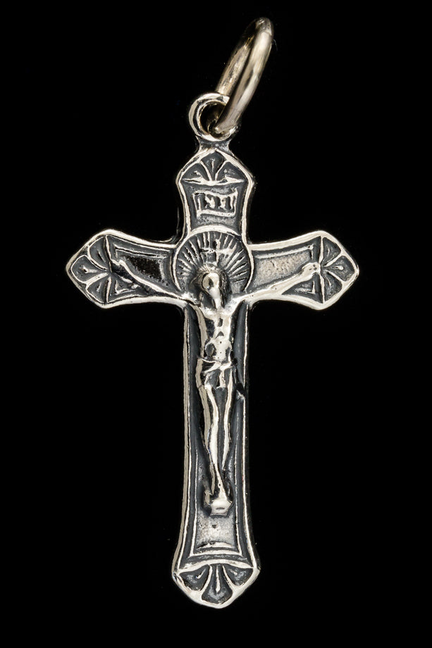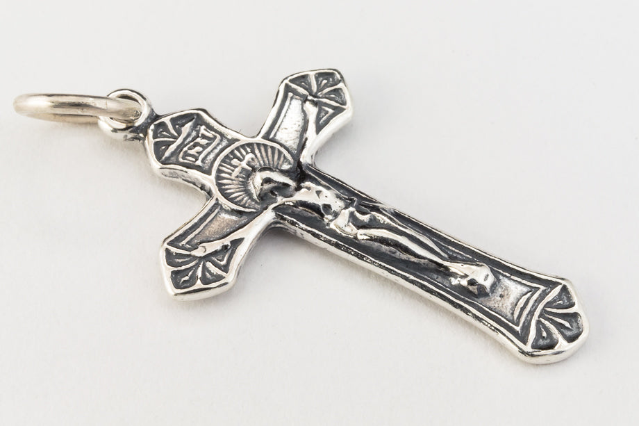 28mm x 16mm crucifix with loop and 4mm open jump ring.