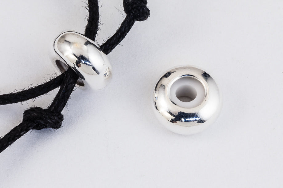 Hole measures 2mm, fits up to two pieces of 1mm cord.