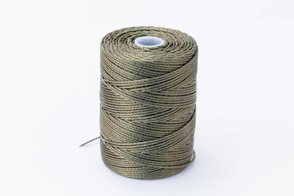 Olive bonded nylon beading cord for a variety of projects including bead crochet, kumihimo braiding and micro-macrame.
