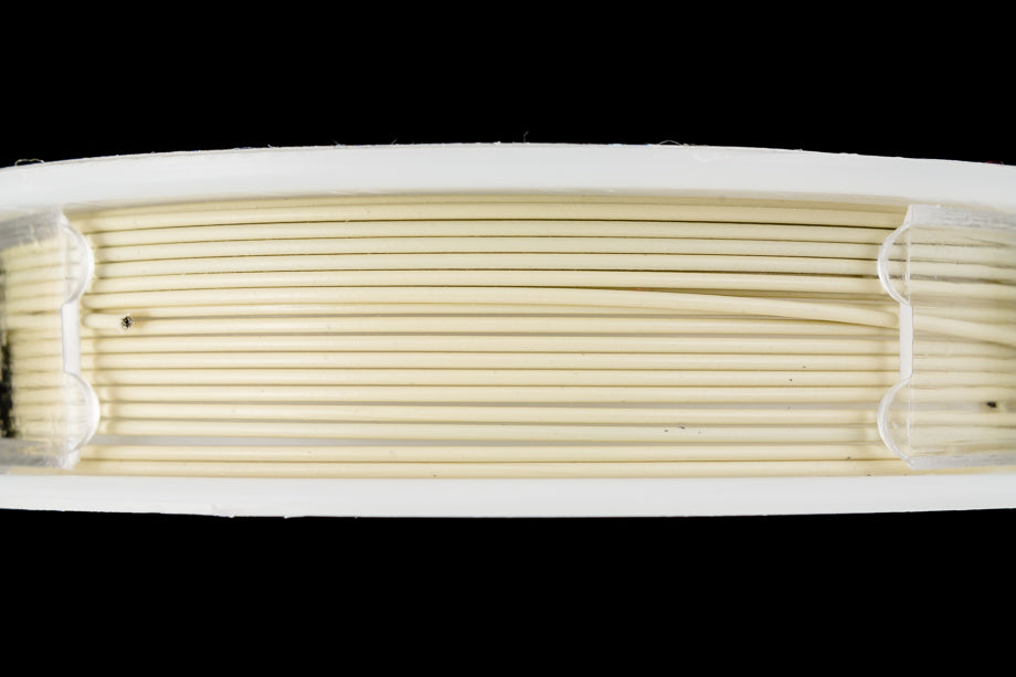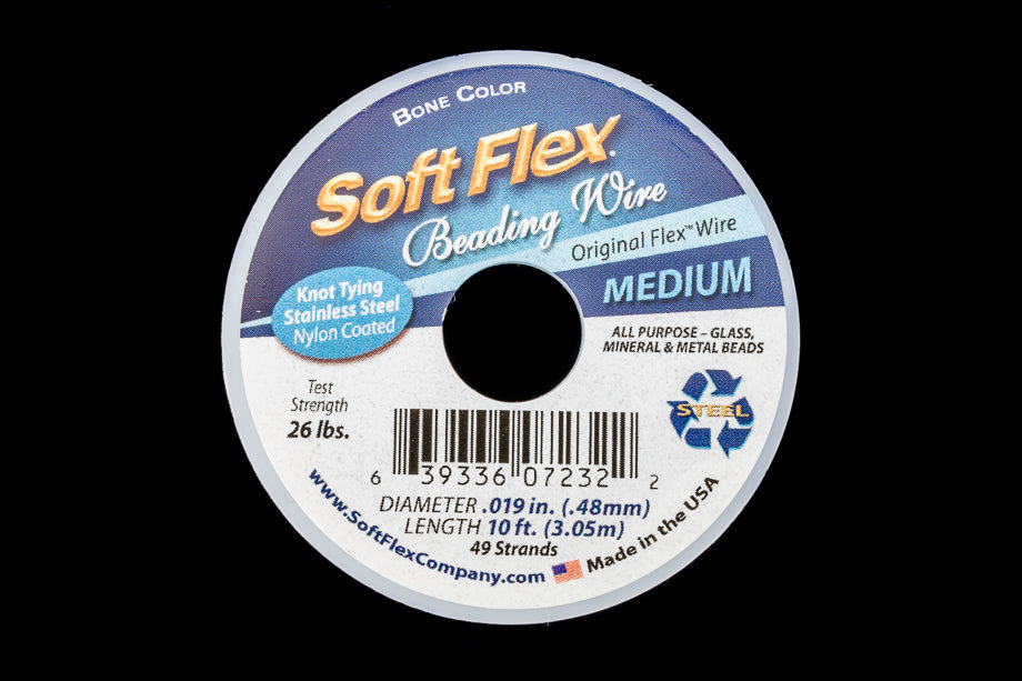 Clear nylon over 49 strands of stainless steel wire with bone color coating.