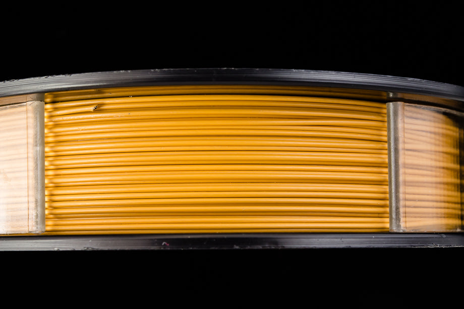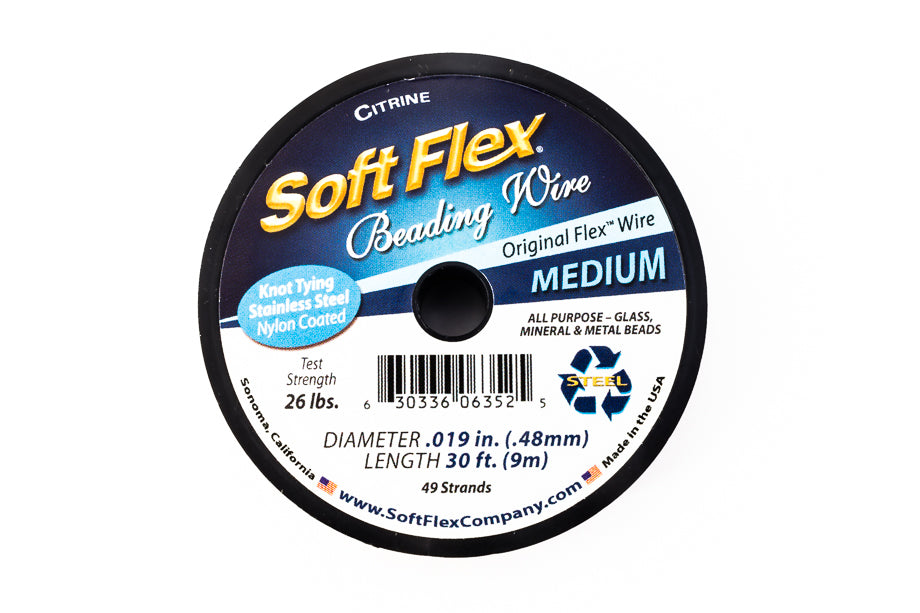 Clear nylon over 49 strands of stainless steel wire with citrine color coating.