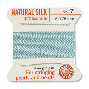 Silk pearl cord with attached wire needle for bead stringing.