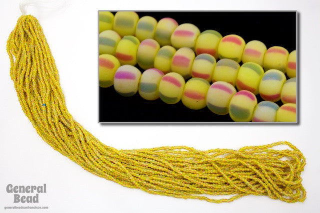 Size 11 matte opaque yellow seed bead with red and green stripes.