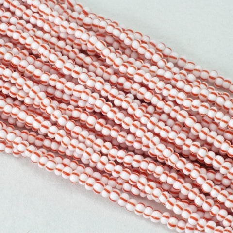 Size 3 (about 5.6mm) opaque white seed beads striped with red.