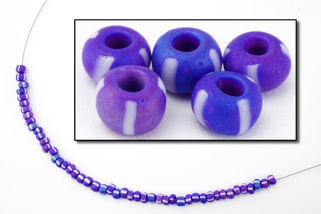 Size 6 matte opaque iridescent royal blue seed beads with white stripes.