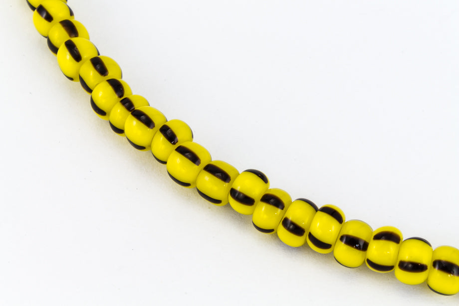 Size 8 opaque yellow seed beads with dark brown stripe.